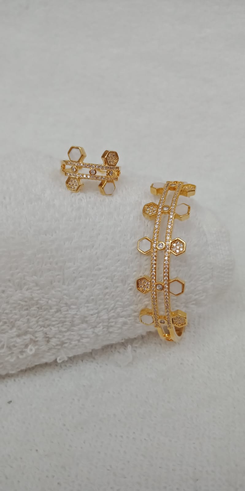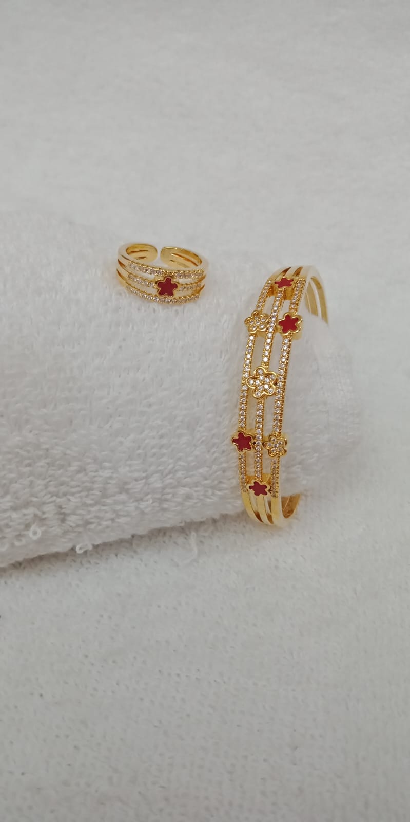 This Kada and Ring Set is the perfect addition to any trendy wardrobe. Crafted with high quality materials, this set has the appearance of real gold without the high price tag. Elevate any outfit with this stylish and durable set.